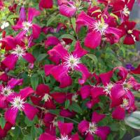 С июня по сентябрь лиана покрывается винно-красными цветками диаметром 6-8 см, с контрастно выделяющимися желтыми тычинками.